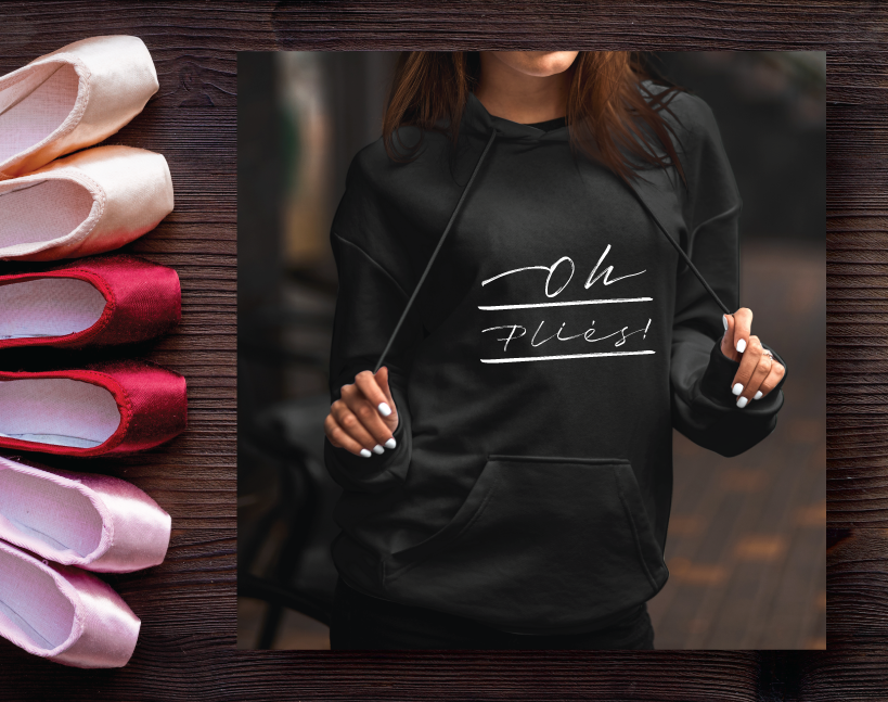 Cute play on words for the ballet dancer. Soft oversized hoodie with pocket and drawstrings. Design is heat pressed on front.